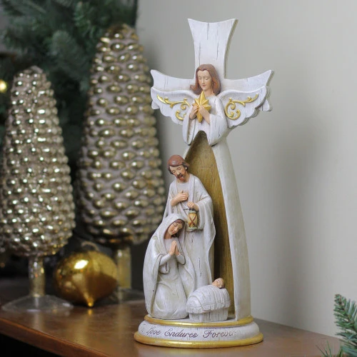 This beautiful statue that comes with Mary and Joseph lovingly gazing upon their newborn son Jesus nestled inside of an angel would lend a heavenly bliss. Impress your guests with this classic scene in a lovingly made decoration. This statue is meticulously detailed, and your guest will undoubtedly be asking where you bought this.