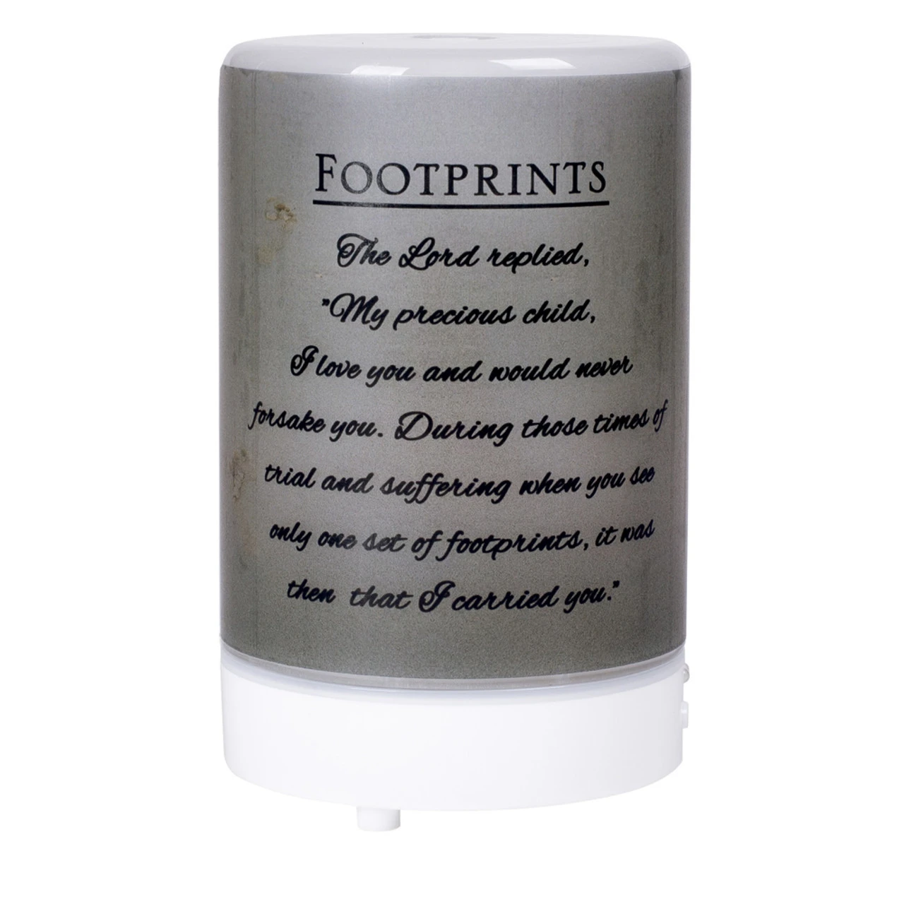 Diffuser reads “Footprints…The lord replied, “My precious child, I love you and would never forsake you. During those times of trial and suffering when you see only one set of footprints, it was then that I carried you.”
