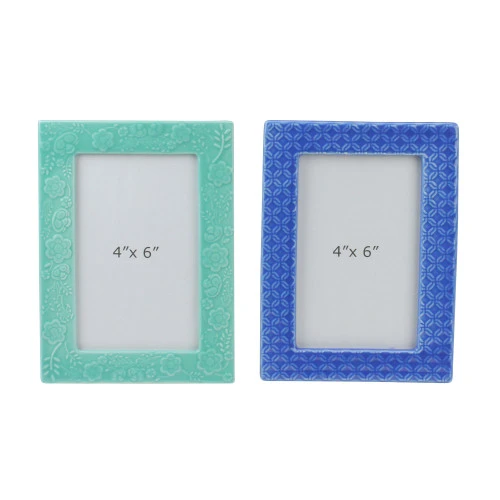 Show off your favorite vacation picture, a photo of your child or fur-baby in these unique embosses frames. These frames come in a blue and green finish. The blue frame has a geometric embossed design and the green frame has a floral embossed design.