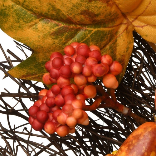 - Features maple leaves, pumpkins and gourds from a woven branch ring base