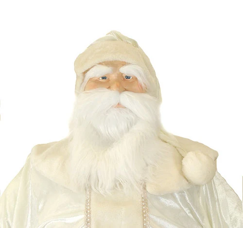 Santa is wearing a plush cream velvet suit with cream cuffs and trim