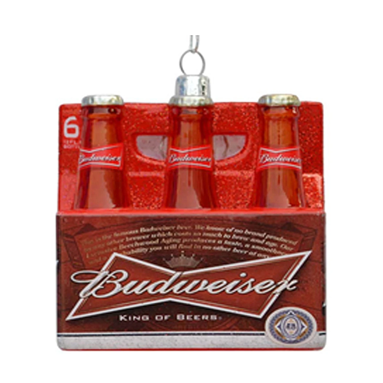 Features a replica of a six-pack of Budweiser glass bottles in a classic red box
