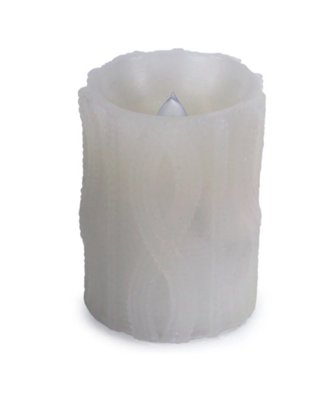 Battery operated candle has a timer that can be set for 4 hours or 8 hours of “burn” time.