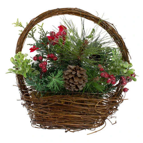 Features a vibrant red cardinal among berries, pine cones, pine sprigs and other mixed foliage