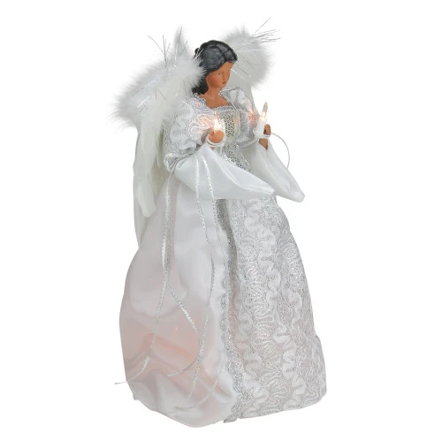 Dark Skin angel wearing a white and silver dress