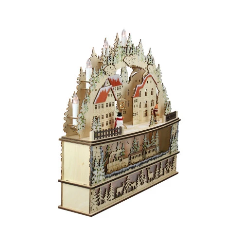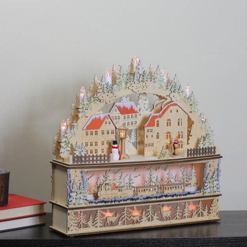 The village is surrounded by snow-covered trees with a woodland scene on the third tier